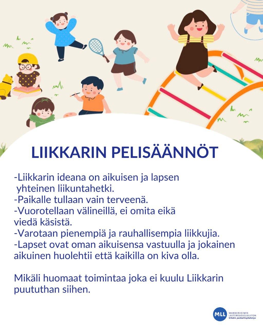 Liikkari on maksuton eikä ennakkoilmoittautumista tarvita. Mikäli kerho peruuntuu, siitä tiedotetaan MLL Vihdin Facebook sivulla.